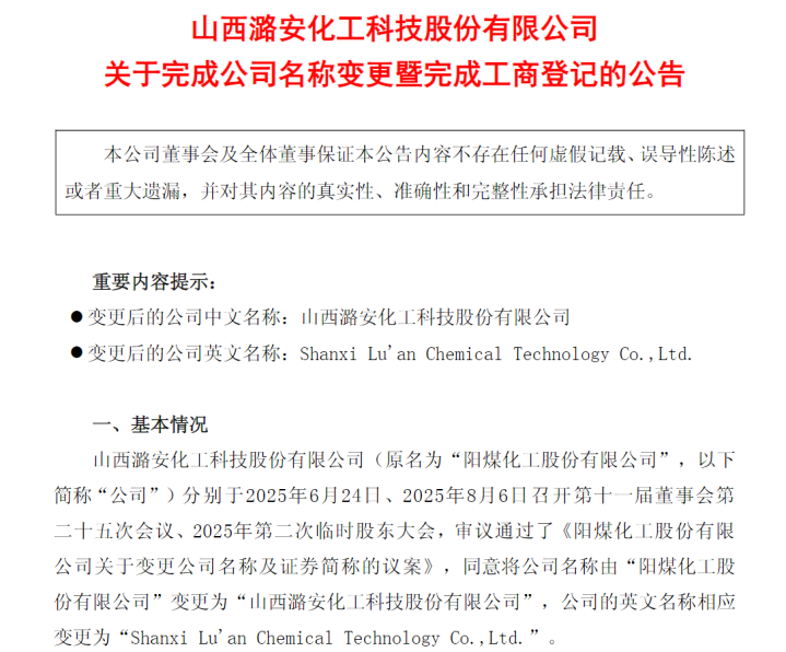 上证报中国证券网讯(武斌记者李苑)阳煤化工9月1日晚发布公告称,公司于近日完成了名称变更事项的工商登记手续,并取得了山西省市场监督管理局换发的《营业执照》,变更后的公司名称为“山西潞安化工科技股份有限公司”。